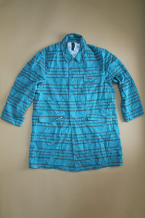 A cropped overcoat jacket, tailored in Japan from jacquard fabrics woven in England to weaving patterns from the mid-20th Century.