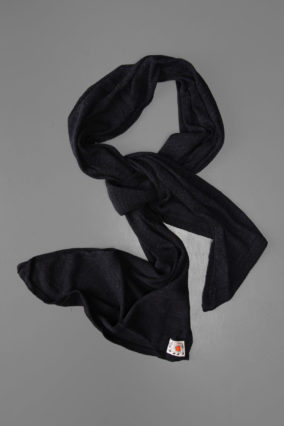 The Rib Scarf is knitted as an extended sleeve of the type 760 Rib Pullover, with a cuff at each end. The chunky yarn is plied (twisted) up of natural undyed Voe Shetland wool and subtly contrasting dyed soft lambswool. The random twist of the yarn creates a flecked texture to the fabric.
