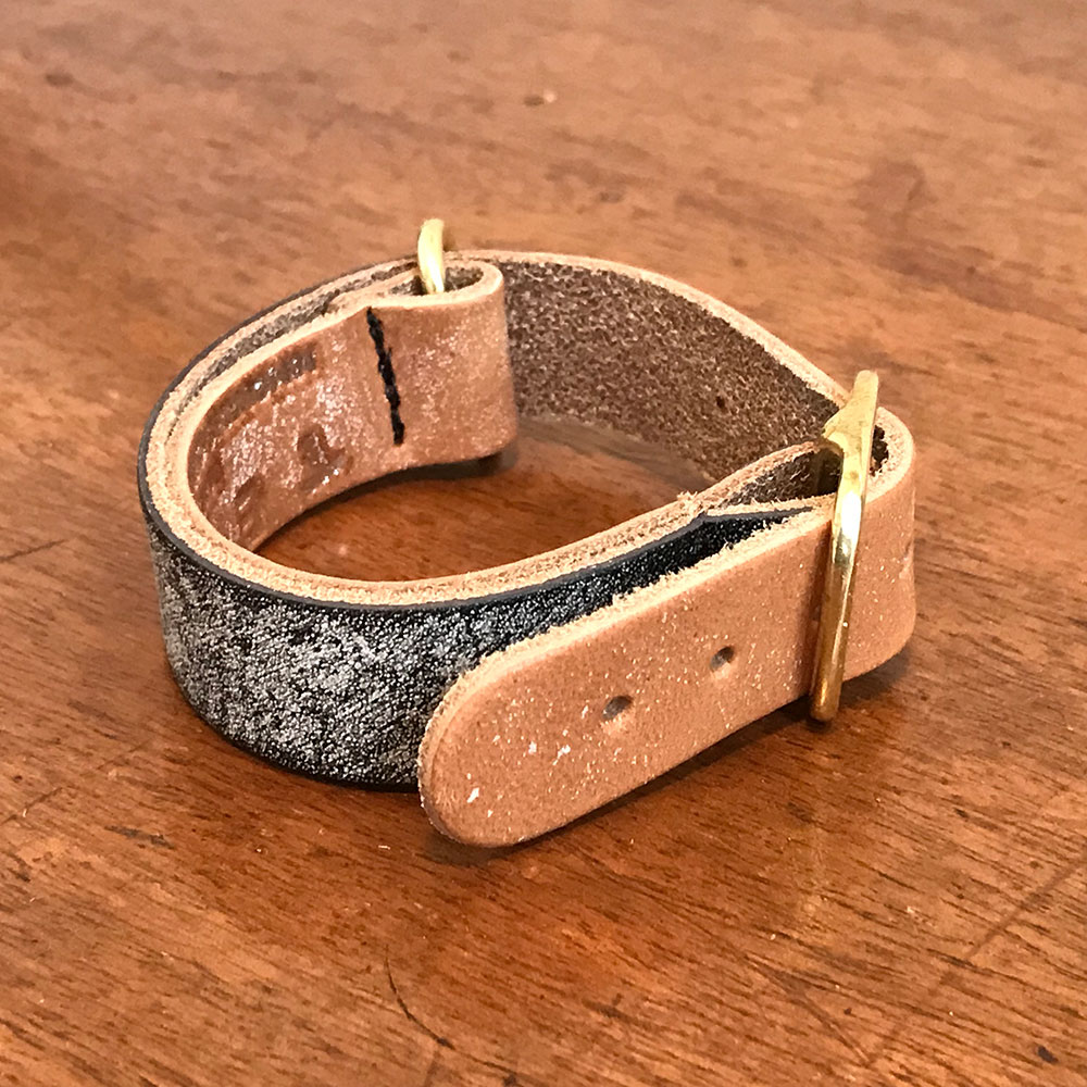 Tender’s watch strap is cut and made in England, from supple leather wattle bark-tanned in England. The buckle and loop are sand-cast from solid brass, also in England. After tanning the leather is stained by hand, or left natural, then heavily greased. The leather will will darken and patinate with age to become unique and personal. Black and brown stained leathers may show a bloom of white tallow, which will quickly rub off.