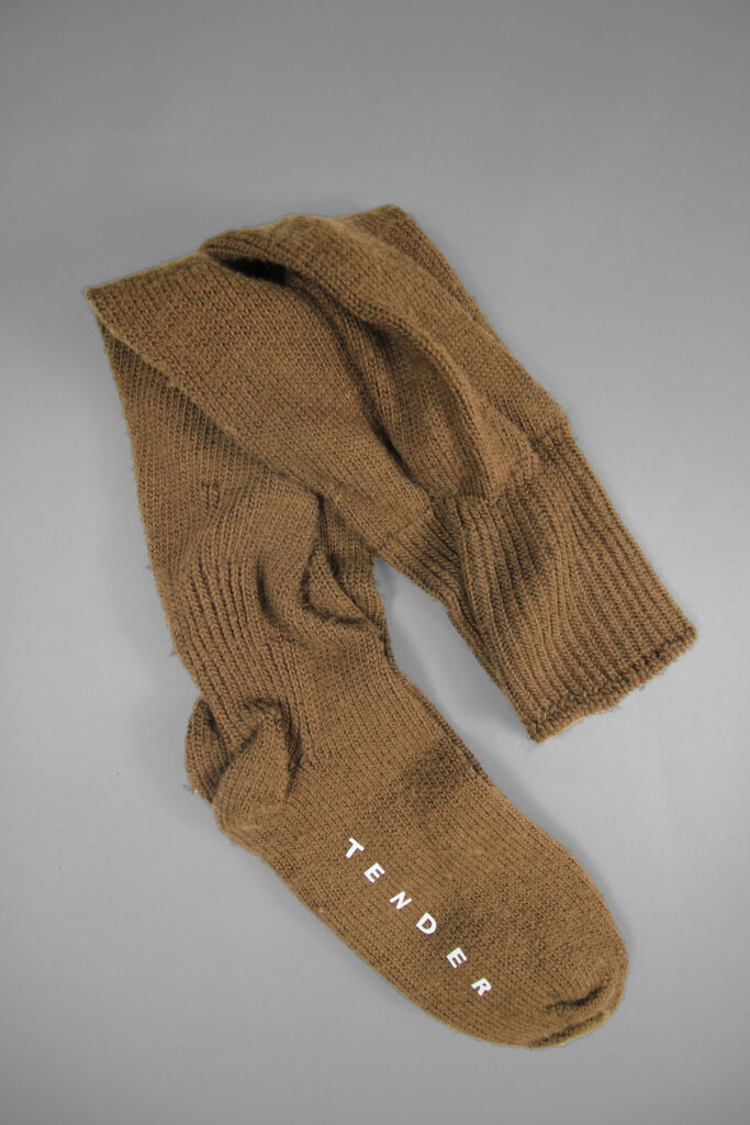 Tender’s Underground socks are knitted and hand linked in England from unbleached wool, with nylon for durability, before dyeing as whole pieces. This pattern was originally made for socks produced for London Underground tunnel maintenance staff, who work in the off hours after the last trains. They are very soft, warm, and substantial and can be worn even in very cold weather.