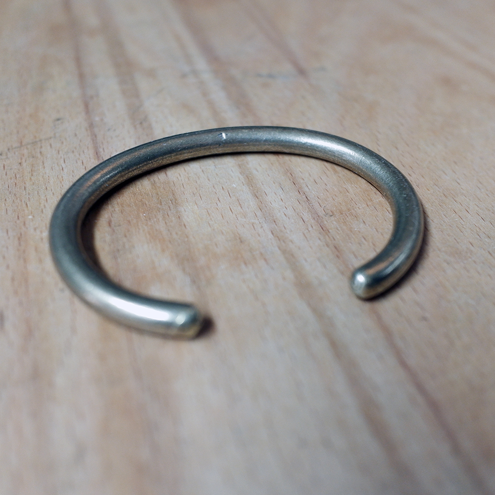 The torc is cast from soft brass, which can be gently bent in or out to adjust the fit. It can be worn with the gap oriented on top of or underneath the wrist.