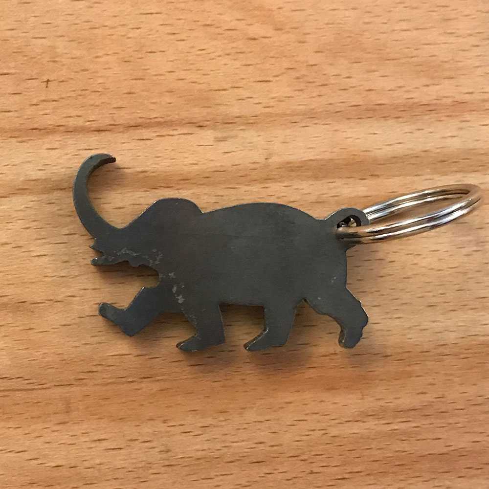 The baby elephant, wearing boots, is the younger sibling of the full size Elephant Bottle Opener, and may also be used to open bottles in an emergency.
