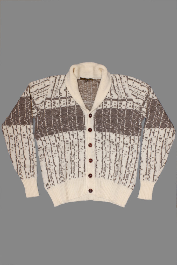 These cardigans are the melodies of three tracks from the Monk’s Dream LP (1952) by The Thelonious Monk Quartet, and three from J S Bach’s Goldberg Variations as recorded in 1955 by Glenn Gould, converted into three knitting patterns. Each pattern is a combination of a track from each LP, switching between the two whenever the music meets at a common note. The cardigans are made up in Scotland as a traditional Fair Isle, using dyed lambswool yarns and undyed natural grey Ryeland wool. The garment is styled after early 1960s knitwear, with contrasting long cuffs and a generous shawl collar which can be worn up or down.