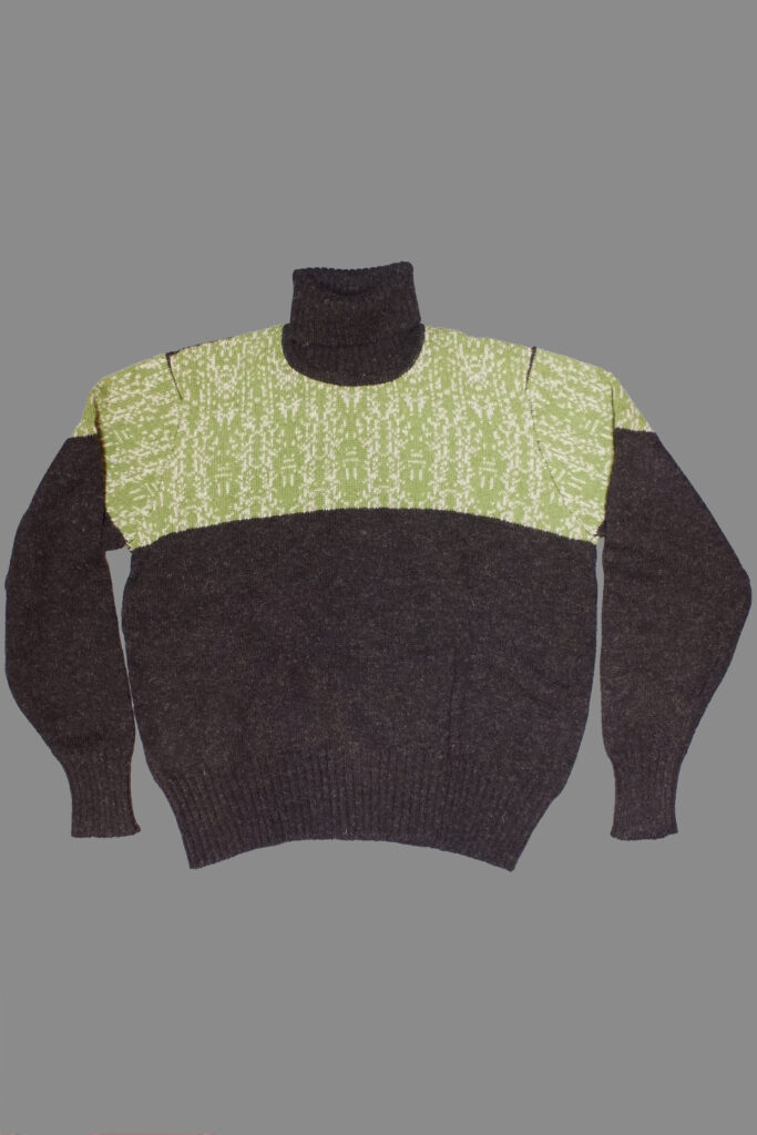 The yokes of these pullovers are the melodies of the seven tracks of the first LP of The Low End Theory (1991) by A Tribe Called Quest, converted into seven knitting patterns. Each pattern is made up in Scotland as a traditional Fair Isle pullover using Shetland yarns. The garment is styled after early 1960s knitwear, with contrasting long cuffs and a high neck rib which can be worn up, close to the neck, or rolled down.