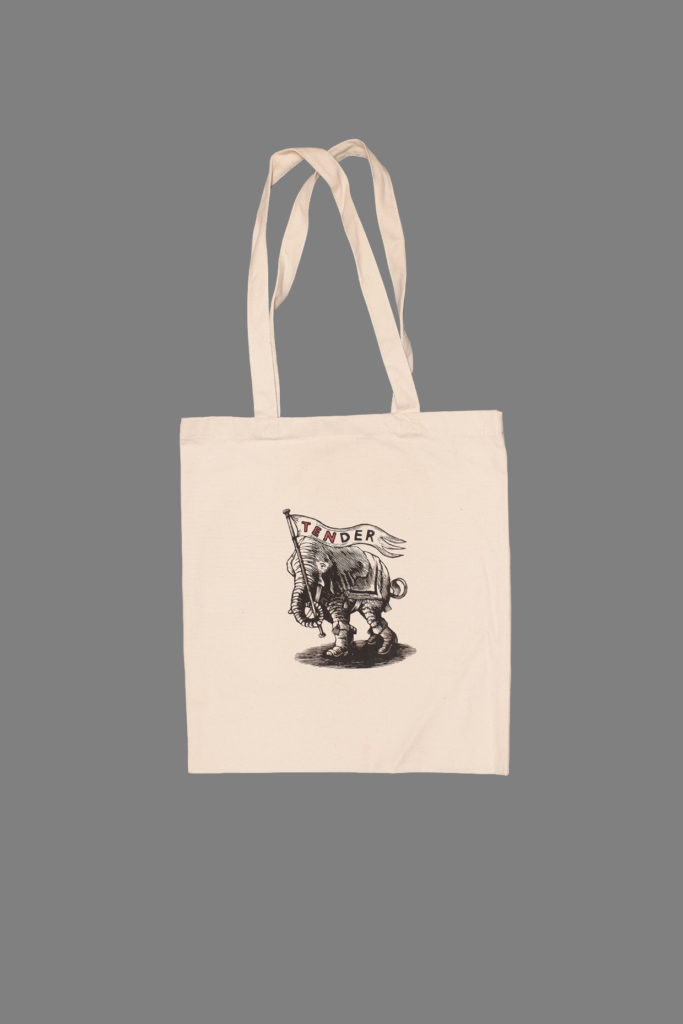 A special anniversary screen print of the engraved Tender elephant. The letters of TEN are left as outlines, and then hand coloured in red. Over time and with washing the red lettering will fade.