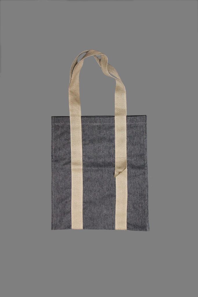 The oversized One-strap tote bag is folded along the bottom edge, so there is no seam to create a weakness in the fabric. A single wide webbing strap loops around the bag twice, creating both handles, and is cut raw on the bias, at the overlap.