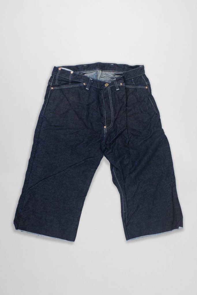 These shorts are cut on the Type 132 Wide Jeans pattern, but, following the season’s experiments with cross cutting, the pattern is laid sideways across the denim fabric. This governs the length of the leg, which finishes with a horizontal selvage line below the knee, and also alters the fit, pulling the shorts in a little slimmer due to the differential shrinkage of the warp and the weft.