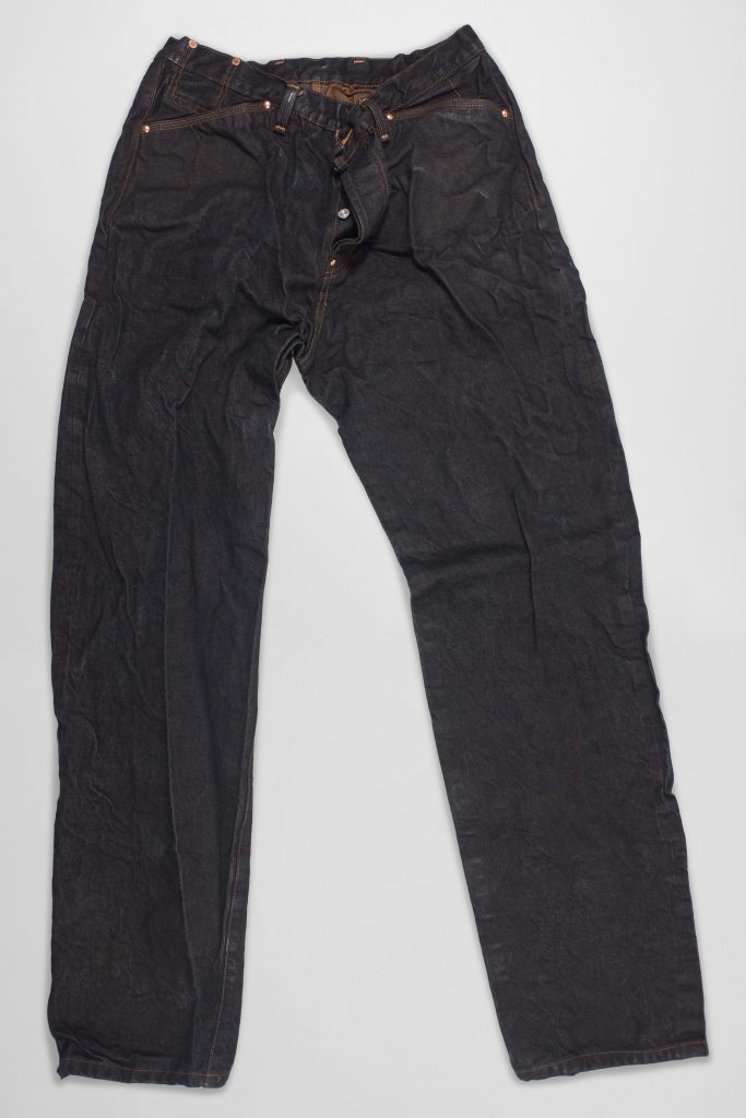 Based on the 132 jeans pattern, 122 jeans do not have back pockets or a back yoke- the seat is shaped by two ‘English’ pleats, facing towards the middle.