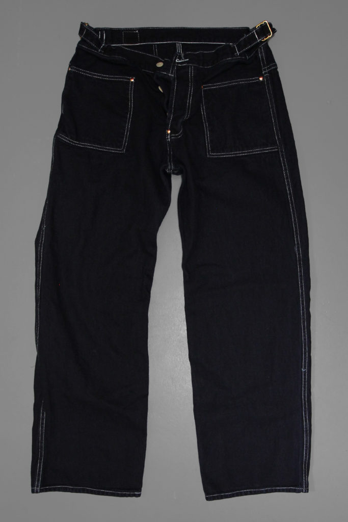 Side Cinch Oxford Trousers are adapted from Type 136 Oxford Jeans, with a wide leg and full seat. The waist can be cinched in with a strap and buckle at each side, and the lined front pockets are patched into the side seams, echoing the simplest workwear overalls pockets.
