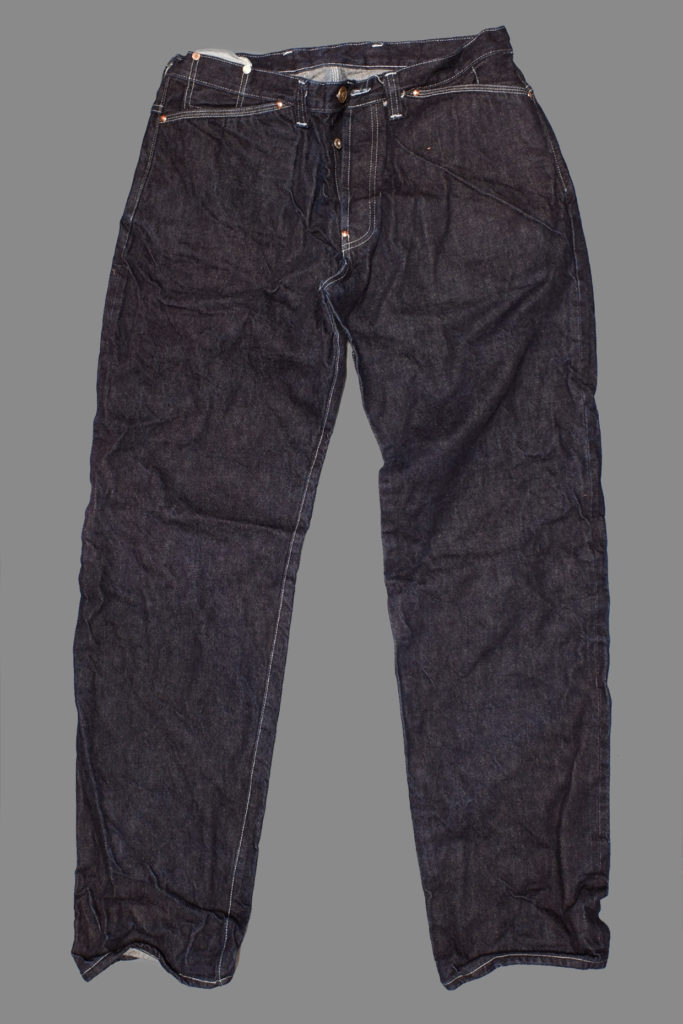 Achilles’ Heel jeans are hand dyed with indigo in Kojima. The jeans are gripped tightly at the hips, blocking the indigo and showing the undyed denim and calico-faced snob’s thumb pocket underneath.