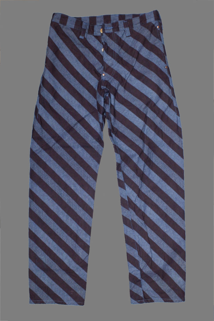 Indigo weaver’s blanket fabrics pattern changes appear randomly across the garment- each piece is unique.