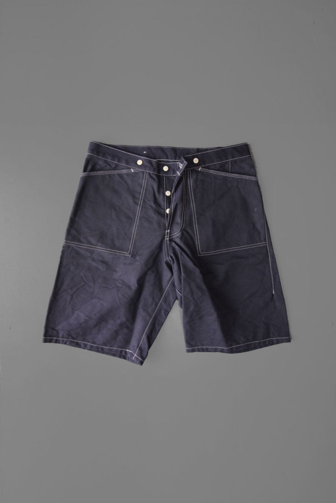 Straight Cut Trews Shorts are cut with a long side dart, but no side seam, so the fabric joins up all around the outside of the hem. The details of these shorts follows type 134 a straight cut version of type 133 trews, made with sewn-down inside patch pockets at the fronts. The canvas versions of these shorts are finished with waistband braces buttons, rather than belt loops on the flannel versions.