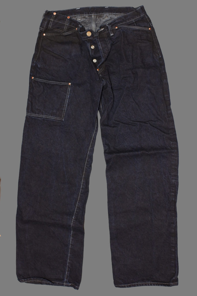 High waist extra wide jeans with a generous seat and thigh, a very roomy straight leg and an extra front thigh gardener’s pocket. This cut is inspired by the ‘Bags’ worn at Oxford University in the early 20th Century.