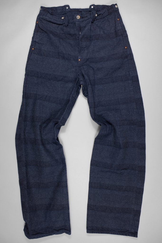 Type 156 Split Back Jeans hark back to the original research in 2010 for Tender’s first jeans, type 132. These were loosely adapted from vintage British Rail uniform trousers, adapted and mixed with other references to jeans and tailoring history. One change was to ‘open’ the original trousers pattern, to become 132 jeans. These 156 jeans, however, have not been opened. A traditional tailored trousers pattern is cut straight, so that the legs hang parallel and the front fly seam runs straight up the cloth: the stripes up the front of striped suit trousers all run straight up and down. Jeans, by contrast, are traditionally cut much more open: the legs naturally spread apart and the grain of the fabric meets in a chevron at the front fly seam.