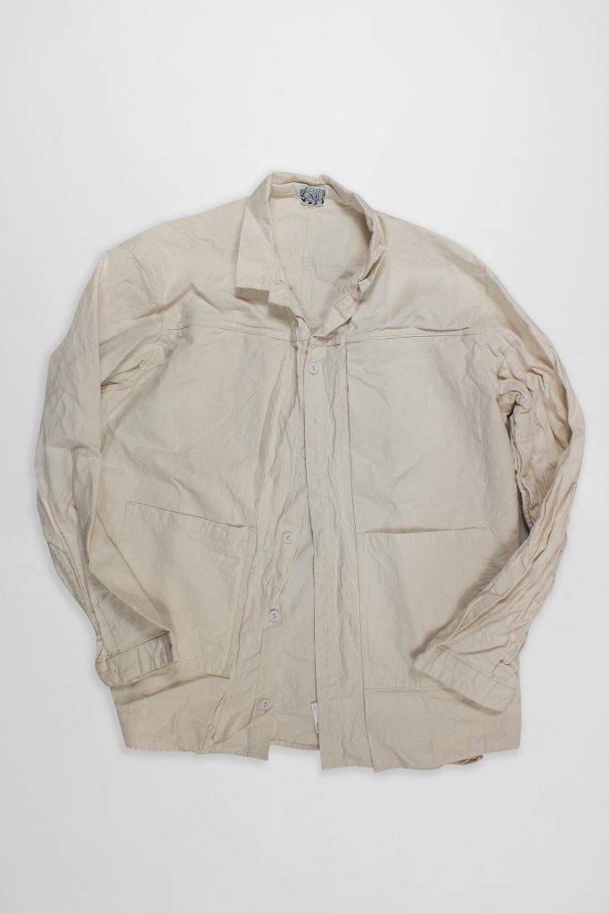 A further step on from the Type 401 Pleat Pocket Shirt, the Two Birds Shirt creates two pockets with one line of pocket stitching. The pattern is cut with a large front panel pleated into the yoke. Once this is pressed into place, a patch pocket is sewn through all three layers of the pleat. This creates a standard hand-height patch pocket on the outside of the shirt, but its stitch lines also hold the pleat together as a deeper chest pocket, accessed vertically.