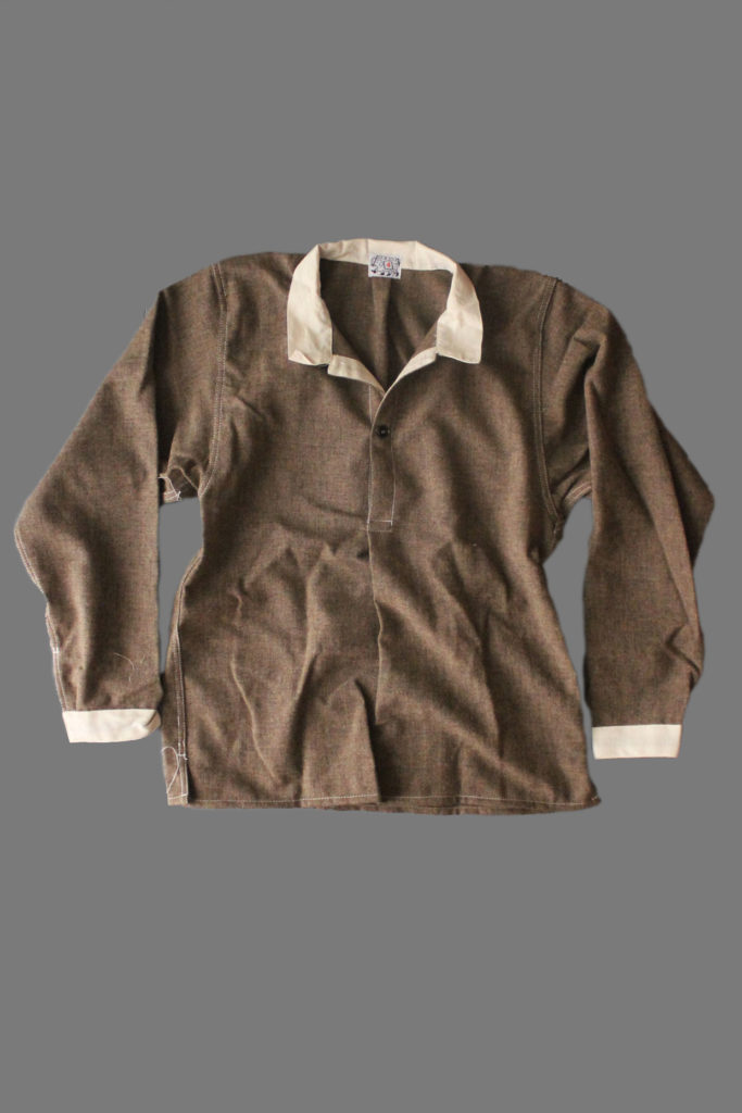 The 411 Pullover Shirt is cut with one body panel which folds straight over the shoulder and is pleated into the front placket and back neck. It is made from traditional woollen flannel fabrics woven in Wales, with collar, cuffs, and plackets made from ecru cotton calico.