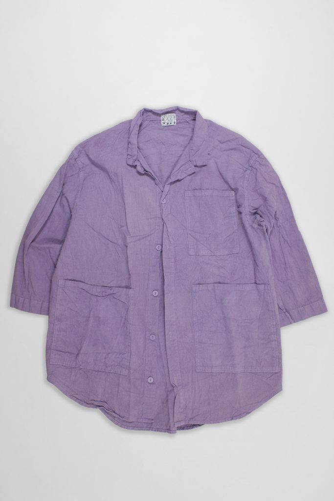 The Frock Shirt is a combination of a three-pocket work shirt and a tailored frock coat. The fabric is cut across the grain, with no side seams, and the shoulder seam is sloped back from the centre of the neck to the back of the armhole, connecting with the sleeve seam which runs along the back of the sleeve to the cuff. This way of cutting recalls 18th and 19th Century dress coats, where the sloped shoulder seam keeps the garment cleaner from the front, and the slight bias allows the fabric to be stretched in over the canvasses.