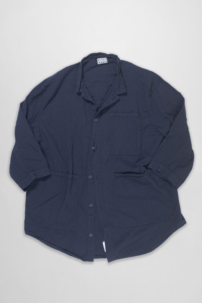 The Frock Shirt is a combination of a three-pocket work shirt and a tailored frock coat. The fabric is cut across the grain, with no side seams, and the shoulder seam is sloped back from the centre of the neck to the back of the armhole, connecting with the sleeve seam which runs along the back of the sleeve to the cuff. This way of cutting recalls 18th and 19th Century dress coats, where the sloped shoulder seam keeps the garment cleaner from the front, and the slight bias allows the fabric to be stretched in over the canvasses.