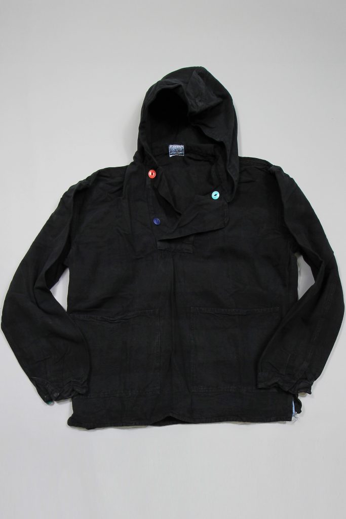 The Double Breasted Pullover Hoodie is a cut-down version of the 499 Dress Shirt, with a large hood cut from the fabric saved from removing the longer shirt tail. The neck opens with an extra wide front placket, overlapping with double buttons. The back is cut flat, and the front has two extra large hand pockets. The sleeves are pleated into false cuffs cut into the seams.
