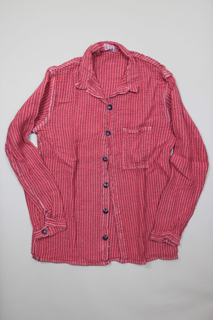The Square Tail Shirt is a straight cut version of the original Tail Shirt, with a single chest pocket shaped after the shirt of an early Tender customer and friend, who cut a chest pocket out of the fabric of the original side pockets. The false cuffs are cut into the sleeve seam, and the navy melamine buttons are oversized deadstock catseyes, found at a Savile Row trimmings merchant.