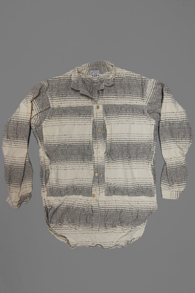 The Periscope Pocket Tail Shirt is made with pockets which echo the large chest pockets of generic work shirts, accessed from the middle at the top. Periscope pockets have an additional opening at the lower outside, so they can also be used as hand-warmers. Larger objects could be fed in and pulled out from the top, hands and smaller items can be slipped in from the sides.