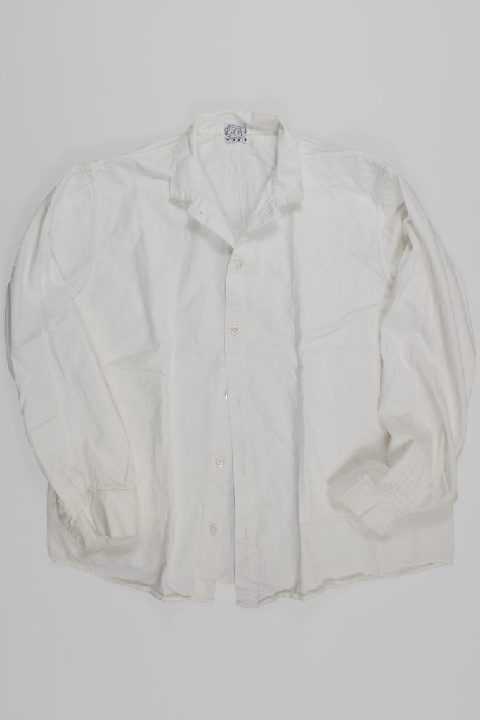 The shirt is cut on the Tender Butterfly block, with no side seams and reversed sleeves, joined along the top sleeve and into the shoulder. Unlike previous butterfly shirts, cuffs open with full tailored plackets behind the wrist.