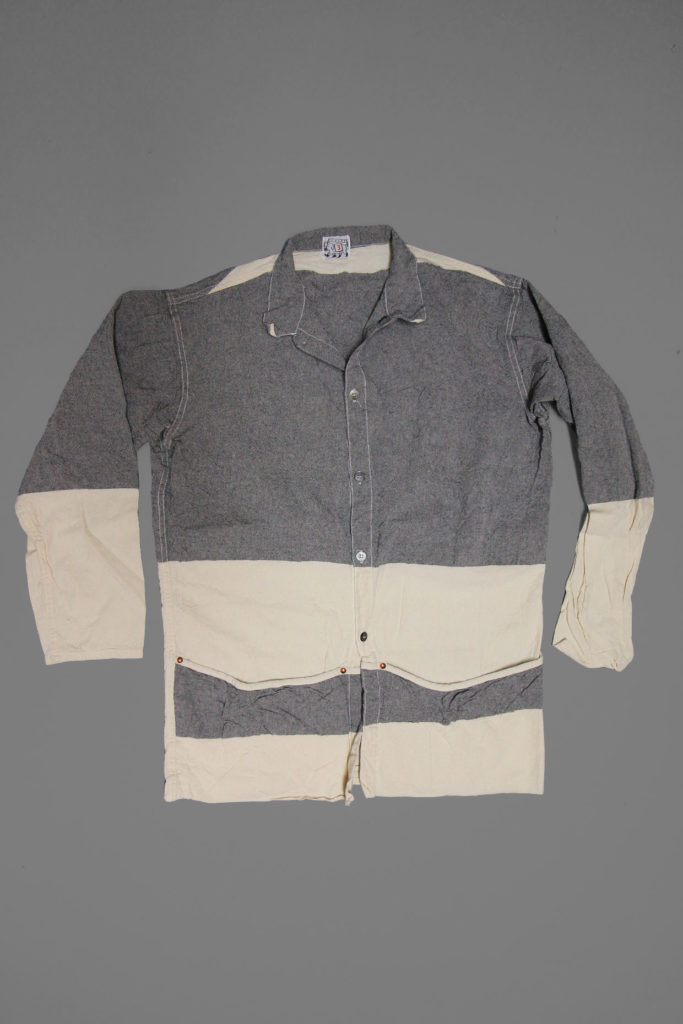 The front panels of the Folded Pocket shirt are folded up at the hem line, creating a large pocket with a curved bias-bound edge. The lower front, below the pocket line, is unbuttoned, for wearing layered, and the sleeves are hemmed plain with no cuff.