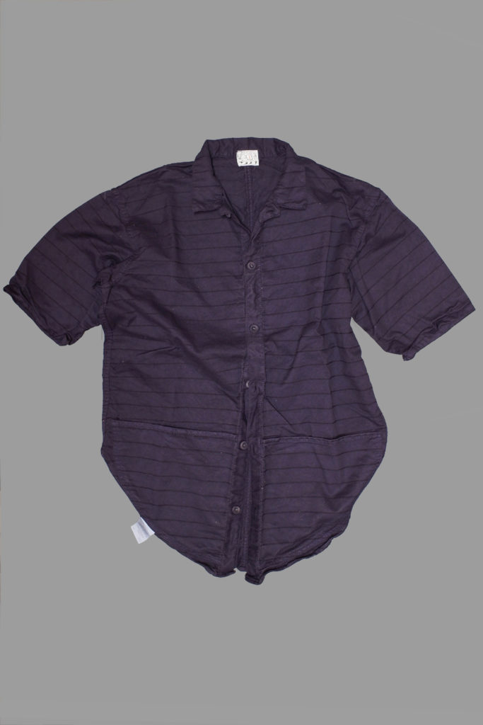 The Short Sleeve Compass Pocket Shirt has symmetrical semicircular front and back tails, with large concentric curved pockets (drawn with a compass) all the way around each front tail.