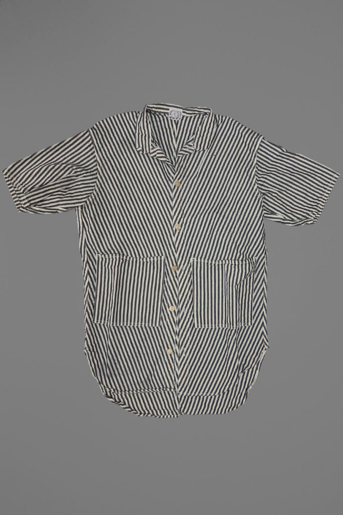 The Boomerang Shirt is cut without a shoulder seam. Usually this requires a straight horizontal shoulder, like a kimono, but to give a more comfortable fit this pattern is sloped over the shoulder. This sets the front and back parts of the shirt at an angle to each other, making a large boomerang-shaped panel. This also means that the grain of the fabric is pushed onto the bias down the body. Cutting this way makes the Boomerang Shirt slightly stretchy with a very satisfying bounce to the pockets.