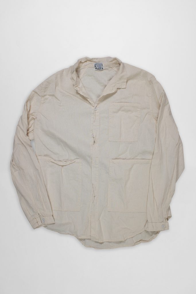 The Frock Shirt is a combination of a three-pocket work shirt and a tailored frock coat. The fabric is cut across the grain, with no side seams, and the shoulder seam is sloped back from the centre of the neck to the back of the armhole, connecting with the sleeve seam which runs along the back of the sleeve to the cuff. This way of cutting recalls 18th and 19th Century dress coats, where the sloped shoulder seam keeps the garment cleaner from the front, and the slight bias allows the fabric to be stretched in over the canvasses.