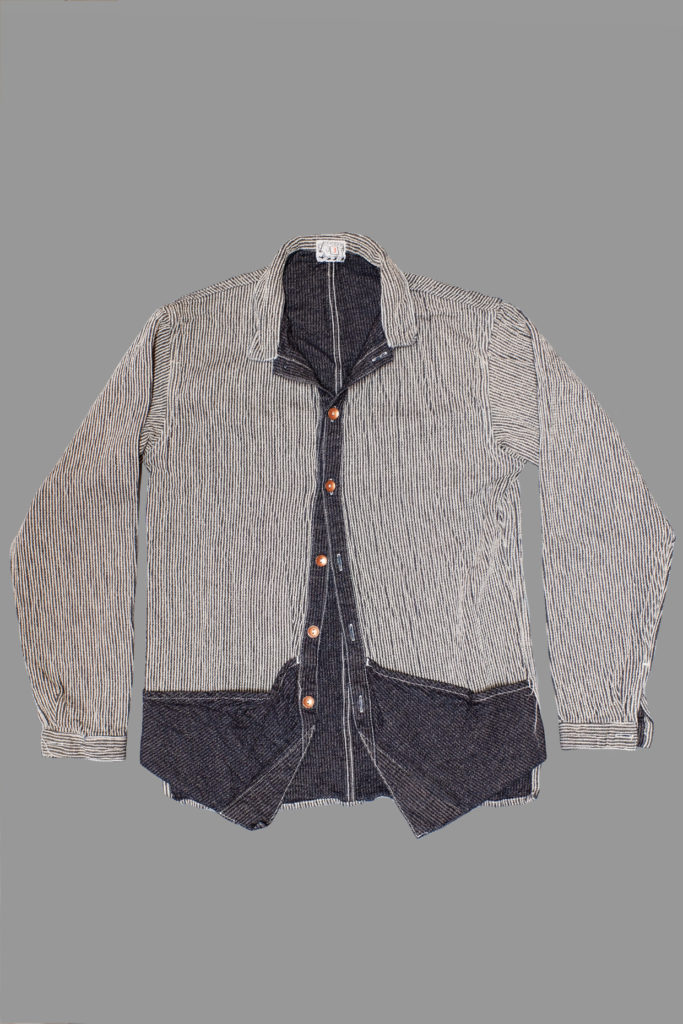 The Baste Pocket Shirt is named after a tailor’s baste- the first rough fitting for a bespoke garment. To allow for maximum alterations for custom clothes, wide inlays are left on the panels at first, and these are folded in and loosely sewn with baste stitches, using a soft easily-broken thread called ‘baste’. After a fitting these inlays are cut away and the garment is eventually finished. The shirt is cut with long straight front panels, which are folded up to form a pocket, and back at the fronts to form a cut-away, like the basted front of a bespoke waistcoat.