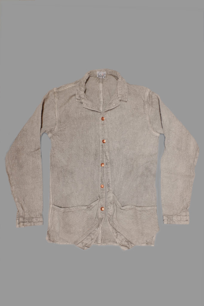 The Baste Pocket Shirt is named after a tailor’s baste- the first rough fitting for a bespoke garment. To allow for maximum alterations for custom clothes, wide inlays are left on the panels at first, and these are folded in and loosely sewn with baste stitches, using a soft easily-broken thread called ‘baste’. After a fitting these inlays are cut away and the garment is eventually finished. The shirt is cut with long straight front panels, which are folded up to form a pocket, and back at the fronts to form a cut-away, like the basted front of a bespoke waistcoat.