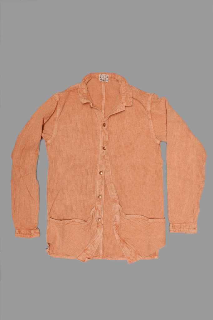 The Baste Pocket Shirt is named after a tailor’s baste- the first rough fitting for a bespoke garment. To allow for maximum alterations for custom clothes, wide inlays are left on the panels at first, and these are folded in and loosely sewn with baste stitches, using a soft easily-broken thread called ‘baste’. After a fitting these inlays are cut away and the garment is eventually finished. The shirt is cut with long straight front panels, which are folded up to form a pocket, and back at the fronts to form a cut-away, like the basted front of a bespoke waistcoat.