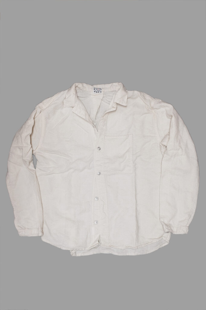 The direction of the back pleat and the front pocket line up when rotated around the centre axis of the shirt, like the blades of a millwheel.The sleeves are pleated into false cuffs, and the hem is finished in a gentle curve.