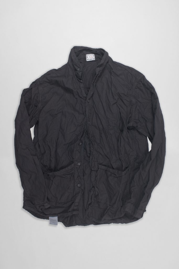 The Bound Edge Flipped Collar Shirt was an experimental tangent on the way to developing the 468 Flipped Collar Shirt. Like the 468, the front placket is reversed and sewn down on the outside, trapping two large centre pockets low down at a comfortable hand height and the collar is flipped upside down so that the long side, not the short side, is sewn into the neck of the shirt. Here, however, the entire edge of the shirt, including the entire collar, is bound in a continuous sweep of ecru cotton bias binding. The idea was to follow earlier bound edge shirts to their logical conclusion, and in the process evoke traditional pyjama jacket construction, with white piping around a blue body and white linen covered metal buttons. This contrast is rendered more or less subtle by the garment dyeing after the shirt is finished.