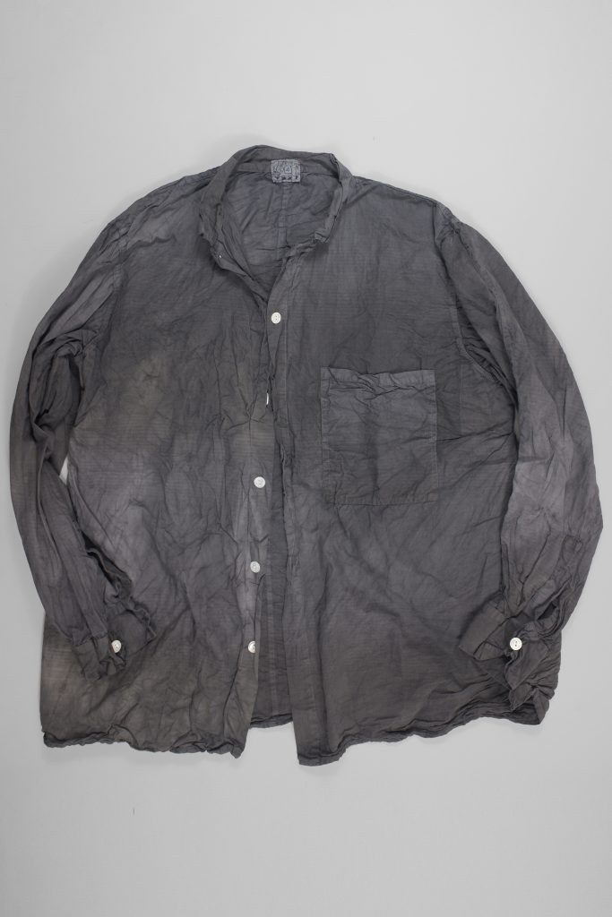 The pleats add volume into the skirt of the garment, which is cut without side seams, so that the tails hang freely without weight or stiffness. A single chest pocket on the left and full tailored cuff plackets behind the wrist refer to more traditional shirt making.