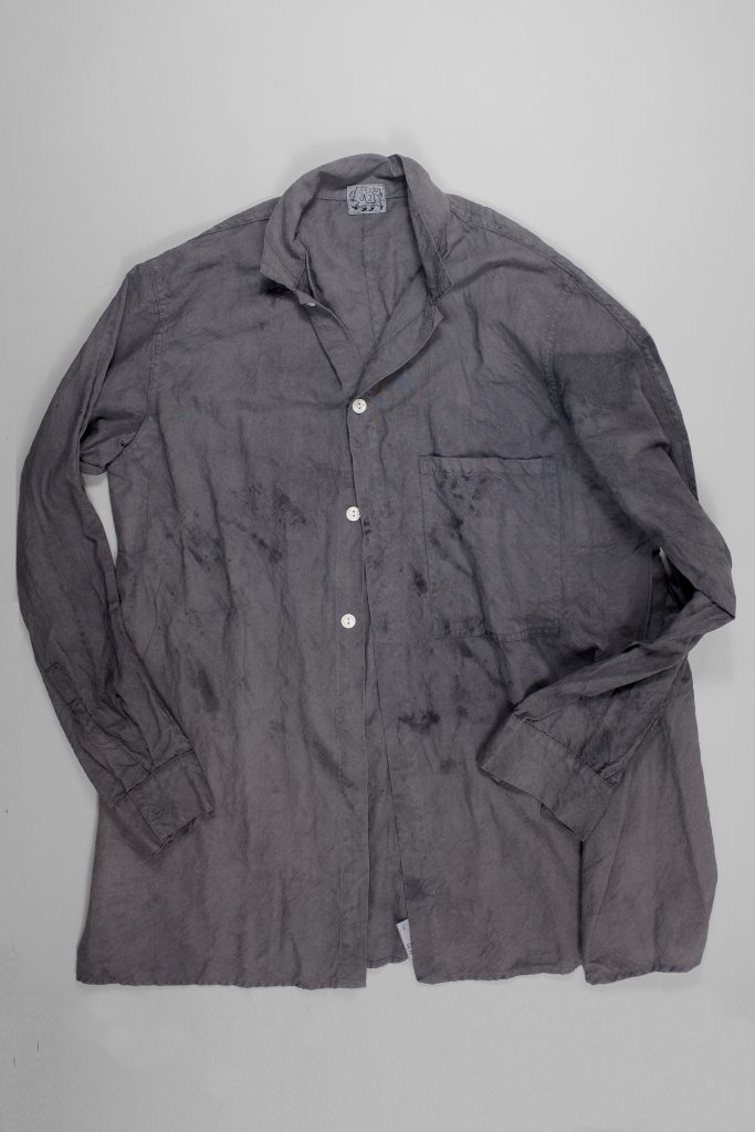 The pleats add volume into the skirt of the garment, which is cut without side seams, so that the tails hang freely without weight or stiffness. A single chest pocket on the left and full tailored cuff plackets behind the wrist refer to more traditional shirt making.