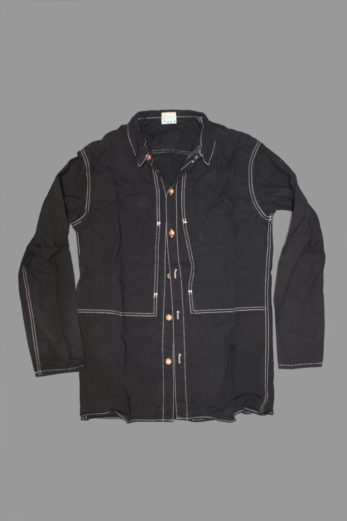 The Yoke Pocket Shirt is constructed with bias-cut yokes running from a seam at the back of the neck over the shoulders, and down to the lower chest. The front yokes are open from the centre as large pockets. The sleeves are cut straight without a cuff, and heavier fabric weights wear well as a jacket.