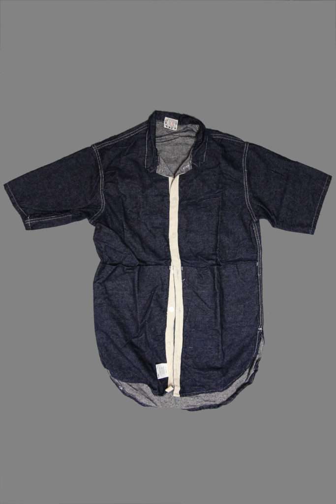 The short sleeved Tesseract Shirt is named for the geometric concept of a four-dimensional cube, where the faces fold in on themselves to form new cubic shapes. The shirt front panels are cut long then folded back in a zigzag to form a large pocket reaching from the front opening to the side seam. To prevent the folds causing too much bulk in a front placket, the buttons and buttonholes are mounted on a strip of cotton herringbone tape.