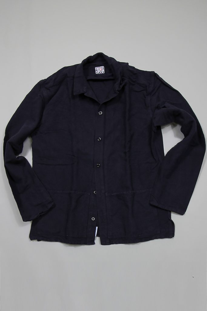 Hadal dyed Tricolore Weft Canvas shirts are cut with half closed shoulders: the outside is fully sewn down but the inside overlap is left open, to show the construction. These versions close with black melamine tailor’s fly buttons.