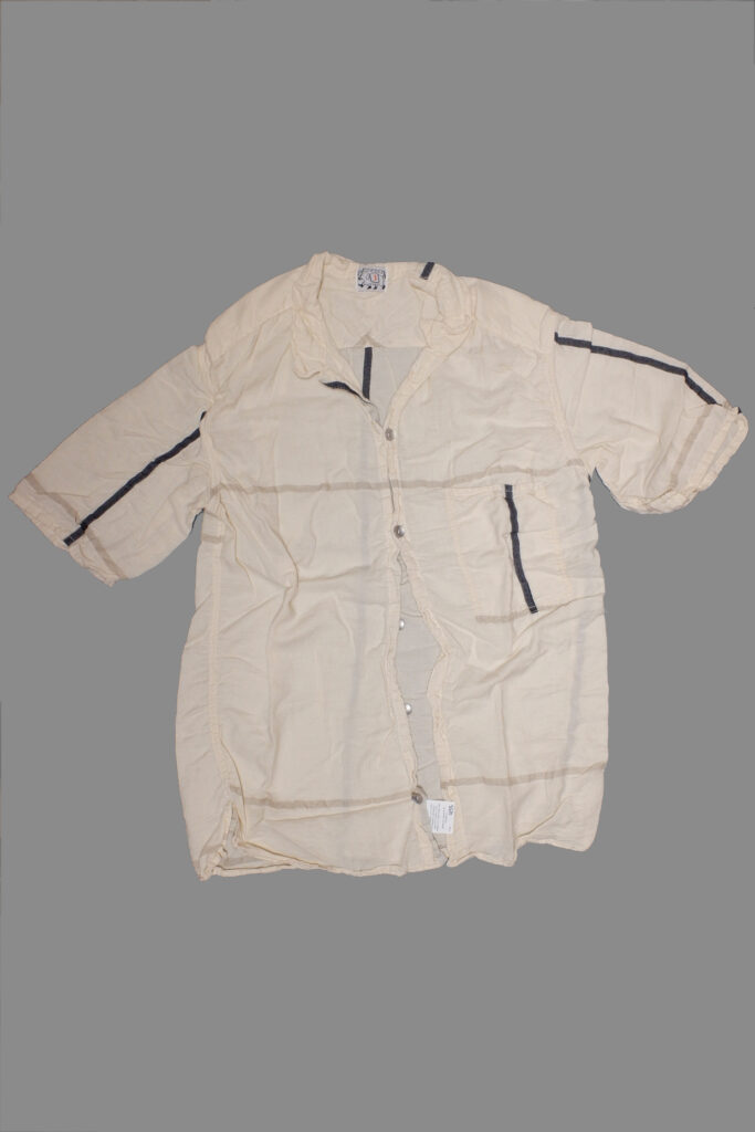 The short sleeved Bench shirt is an edited interpretation of a draught-maker’s shirt, with a single breast pocket and open short sleeves. The stitching at the shoulders appears to make a traditional seamed split yoke, but in fact it shows how the front and back panels overlap, forming a double thickness at the shoulders without any additional seams.