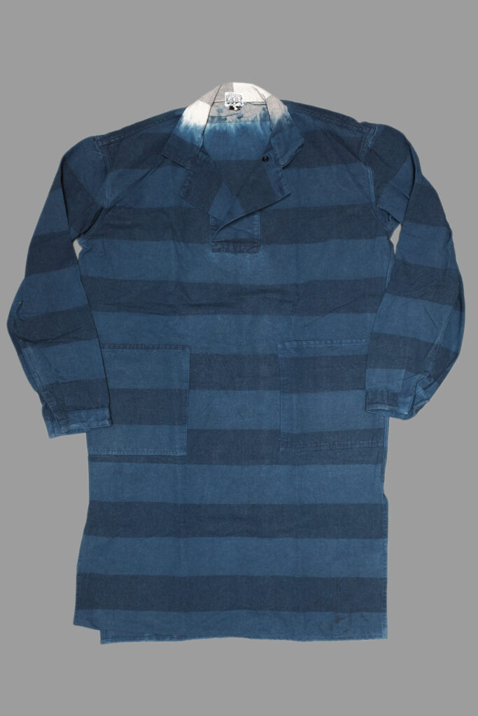 The Double Breasted Pullover Dress Shirt is adapted from the type 413 shirt, cut extra long with deep side splits, to be worn as a dress or long shirt. The neck opens with an extra wide front placket, overlapping with double buttons. The back is cut flat, and the front has two extra large hand pockets. The sleeves are pleated into false cuffs cut into the seams.