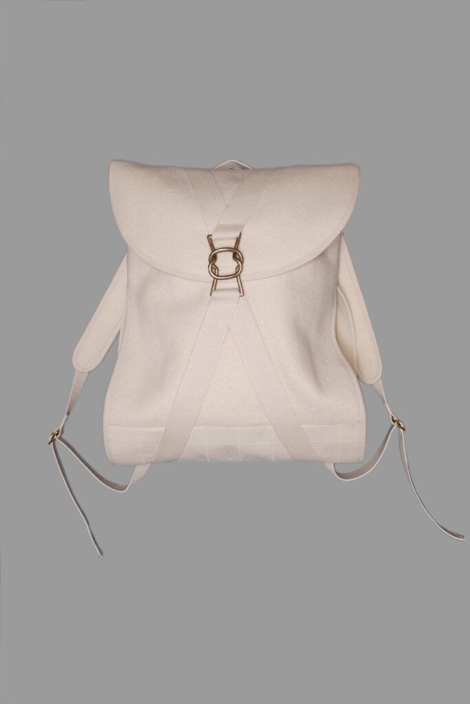 The Elephant Ear backpack is cut from a single piece of heavy fabric bound around the edges with ecru cotton and folded up, with an ear at each side, riveted through to the back with a brass eyelet.