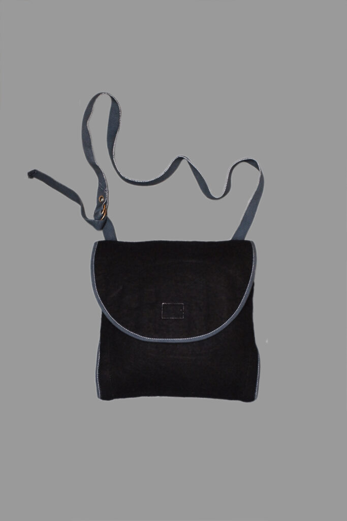 The Elephant Ear satchel is cut from a single piece of heavy fabric bound around the edges with ecru cotton and folded up, with an ear at each side, riveted through to the back with a brass eyelet.