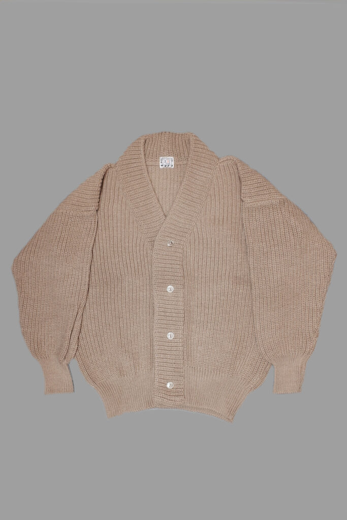 The Round Rib Cardigan is knit in a heavy fisherman’s rib stitch, forming rounded peaks and troughs. The collar and front placket are folded and linked on at full double thickness, forming a pillowy edge to the garment.