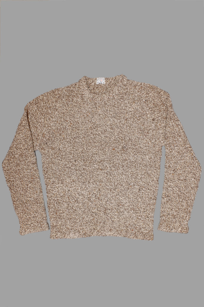 The Purl Edge Crew Neck Pullover is knitted in a plain stitch, then the cuffs, hem, and neck are turned back on themselves showing the reverse ‘purl’ stitch. The thick neck edge sits up from the shoulders slightly, giving the garment substance and structure from the shoulders.