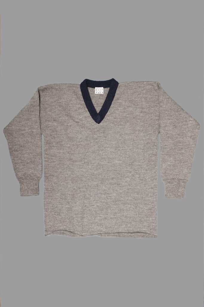 The Donegal Edge Ryeland V Neck Pullover is knitted from fine undyed Ryeland wool, from sheep reared in the Scottish Borders. The mitred neck binding is a contrast, much thicker, soft Donegal yarn. This gives the substance and softness of a much thicker garment, while being thin enough to wear comfortably under a jacket, or in warmer weather. The fully fashioned body is cut generously, with square armholes and shoulders, and the hem is left without any ribbing so that it rolls up. The cuffs are finished in a traditional rib.