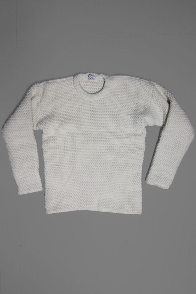 Every panel of the Mirror Panel Double Pullover is knitted fully mirrored, and folded double along the mirror line. The panels are then linked by hand to form a pullover which is double thickness all over- essentially two full garments one inside the other. The whole piece is closed up with a thick tubular neck, and the blackberry stitch texture holds warm air against the body, making a very robust and cozy pullover which can be worn as outerwear.