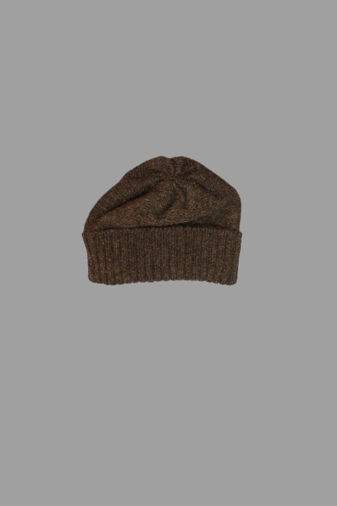 The Drawn Knitted hat is constructed as a tube, then pulled together with a drawthread at the top, and hand sewn together, forming a gathered top with only one seam.