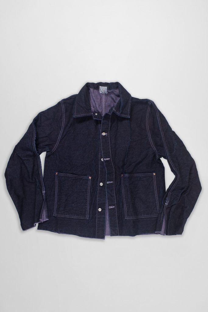 This jacket follows the season’s experiments with cross cutting: the pattern is laid sideways across the denim fabric, which governs the length of the body and sleeves, which both finish with horizontal selvage lines. The body is cut from a single piece of fabric, and the sleeves are fasted along the tops, up to the shoulder seams. Four patch pockets are fastened to the fronts and back of the jacket, and the collar is a fully shaped two-piece construction. Sewn with all-cotton thread and finished with riveted jeans fly buttons. Made in UK red label.